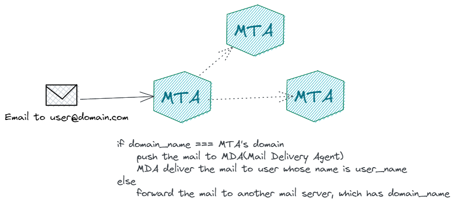 さて、メールアドレスによって配送先が分かるわけですが、実際にはそのメールアドレスを解析して、正常に処理を行うソフトが必要です。そのようなソフトを、MTA(Mail Transfer Agent)と呼びます。 MTA は、メアドを解析し、それに応じて適切な処理を行います。 具体的には、まずメールアドレスのドメインを見て、それが自分のサーバーかどうかを確認します。 もし自分のサーバーじゃなかったら、所定のプロトコルに従って配送先サーバーにメールを配送しようとします。一方で、もし自分のサーバー宛てのメールだった場合、ユーザー部分を確認して、そのユーザーのメールフォルダにメールを配送するように MDA(Mail Delivery Agent:メール配送エージェント)に指示を出します。