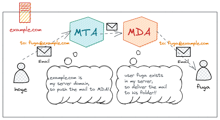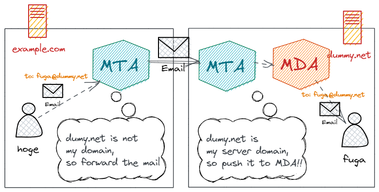 dummy.netが自分自身ではないことを確かめる dummy.netの MTA に向けて、メールを配送するexample.comから来たメールをdummy.netの MTA が受け取るdummy.netの MTA は、ドメイン部分を見て、dummy.netが自分自身であることを確かめる。- MTA は、ユーザー部分を見て、fuga ユーザーが自分のサーバーにいることを確かめる。