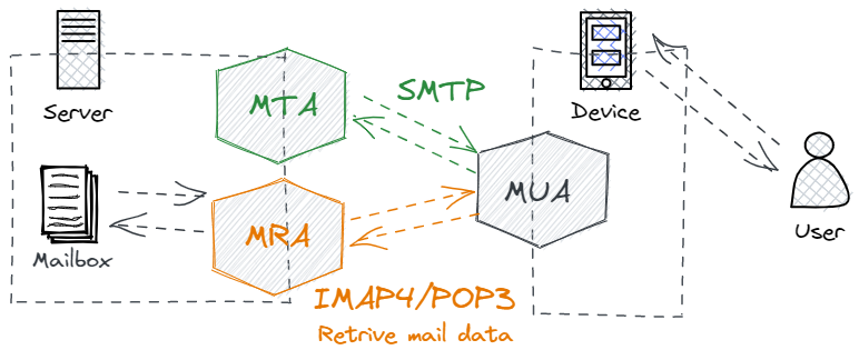 MRA(Mail Retrieval Agent):メール検索エージェントです。 所定のメール保管場所にあるメールを、MUA に渡してあげる機能を担います。渡し方として、POP や IMAP といったプロトコルが定義されています。