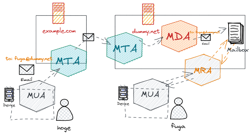 dummy.netサーバーにメールが届き、MDA によって所定のフォルダに配送される。 fuga@dummy.netユーザーがブラウザでメールを閲覧する。- MUA であるブラウザが、IMAP/POP のプロトコルに従って、