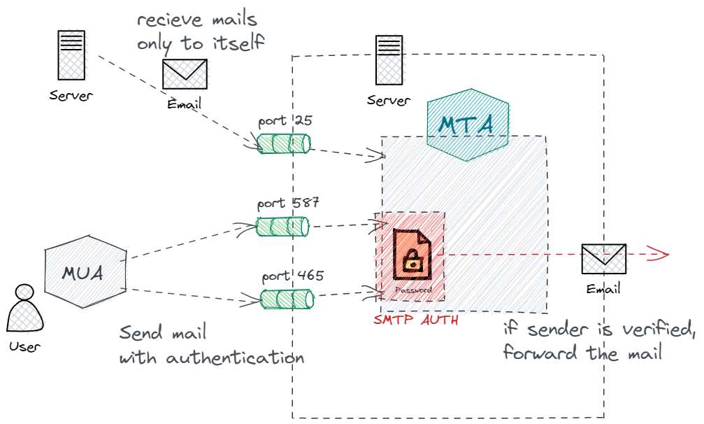 難しくなってきたので一度まとめましょう。 自分がメールを受け取るときは、通常通り 25 番ポートでメールをもらいます。ただし、それが他のサーバー宛てのメールだった場合は送りません。しかし、これでは自分が他のサーバー宛てに送信したメールも送信拒否されてしまいます。 そこで、submission ポートの出番です。587 番ポートにアクセスして、ユーザー名とパスワードを入力します。すると、SMTP-AUTH に従って、SASL が認証を行います。その認証に成功したら、相手の 25 番ポートに向けてメールを送信します。 これにて、認証を行いつつ、メールの送受信ができるようになりました。